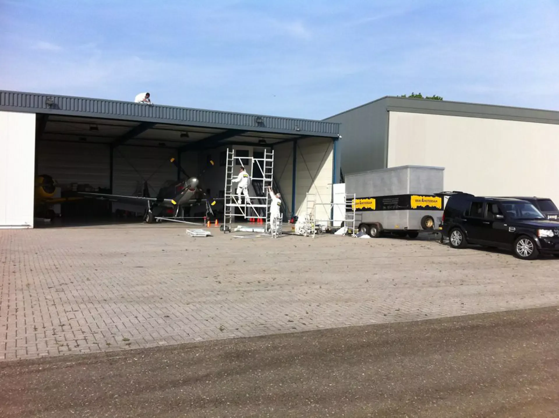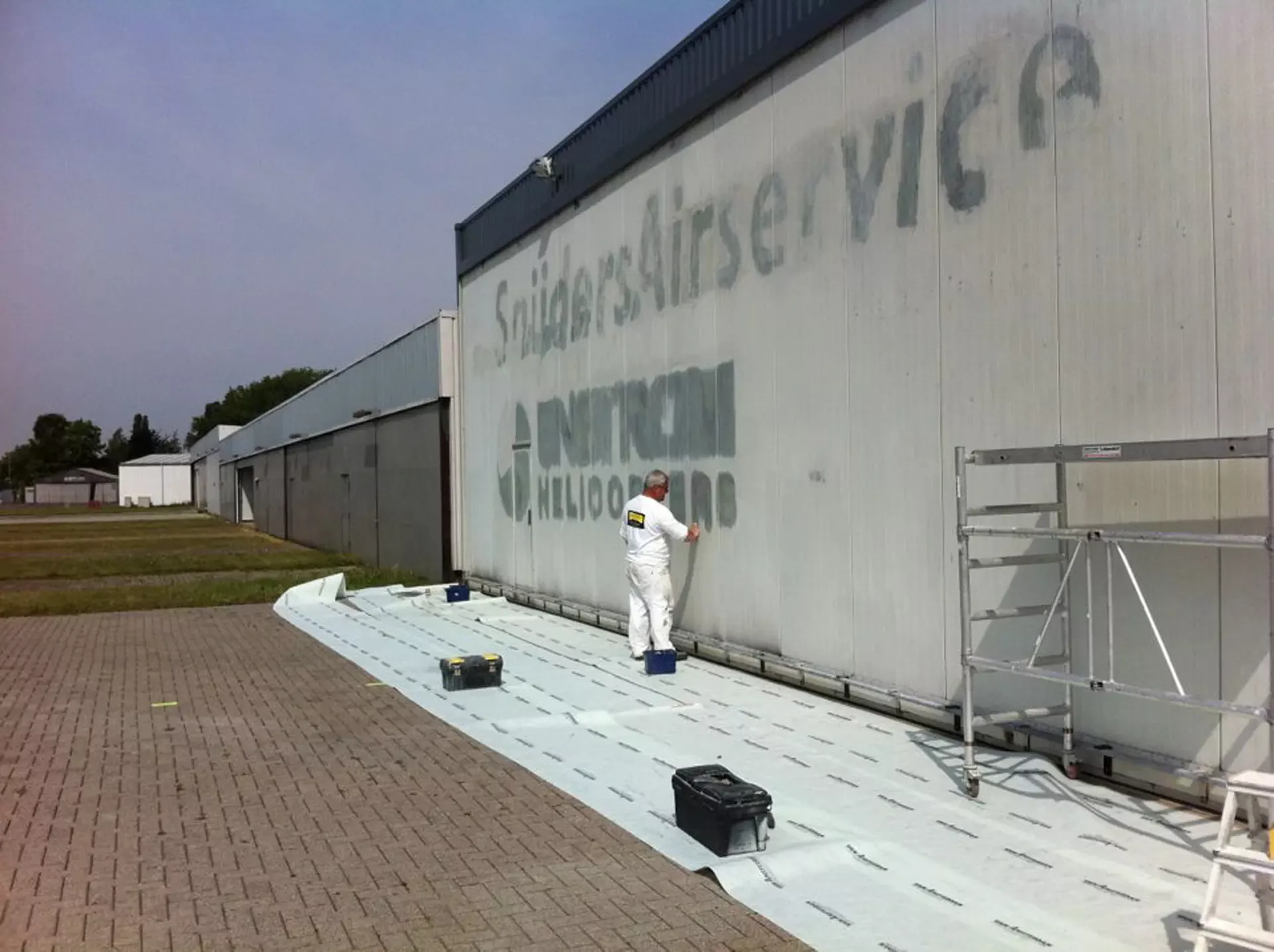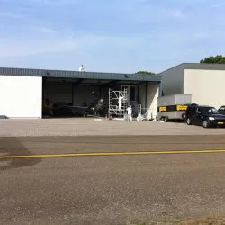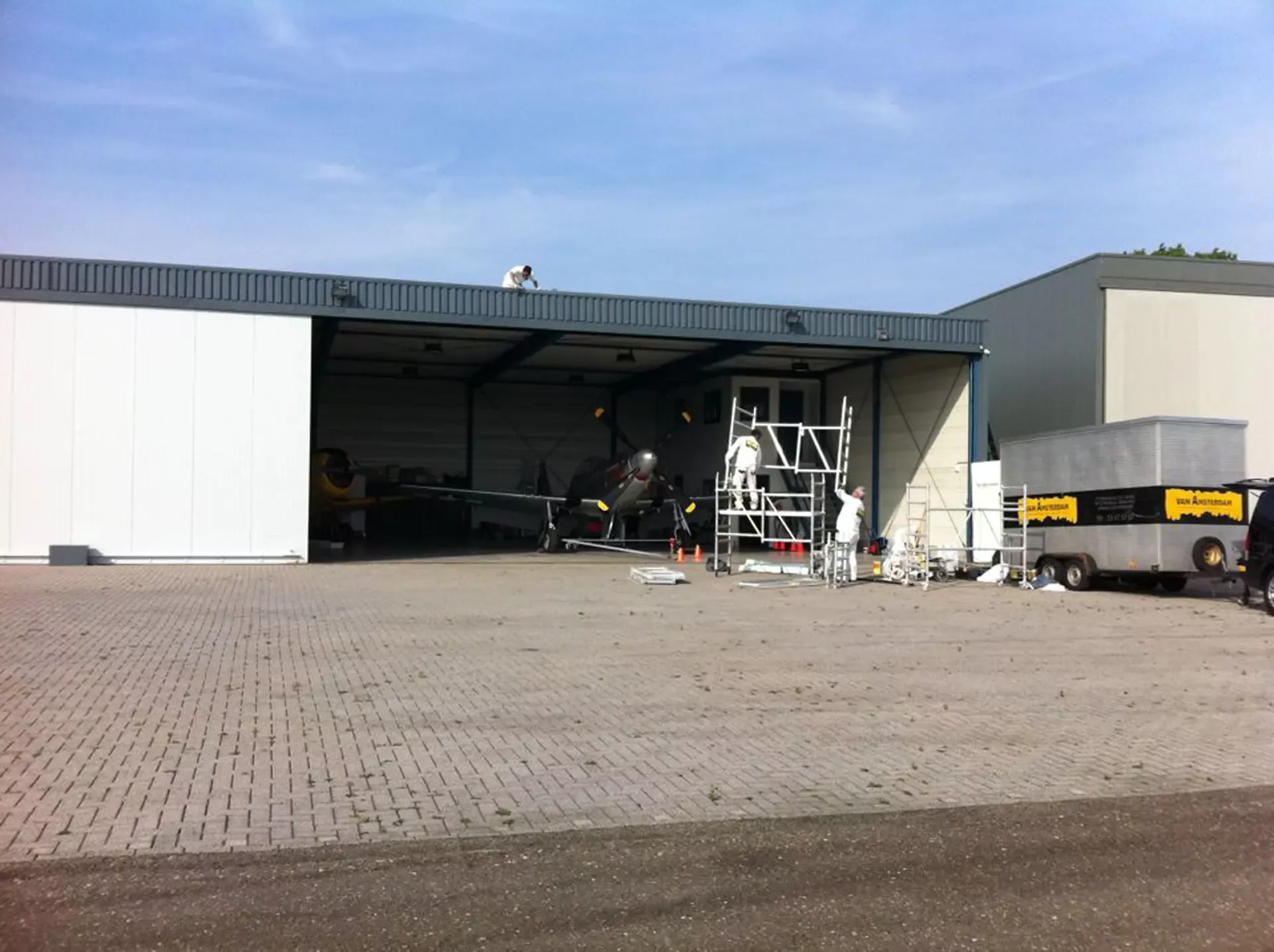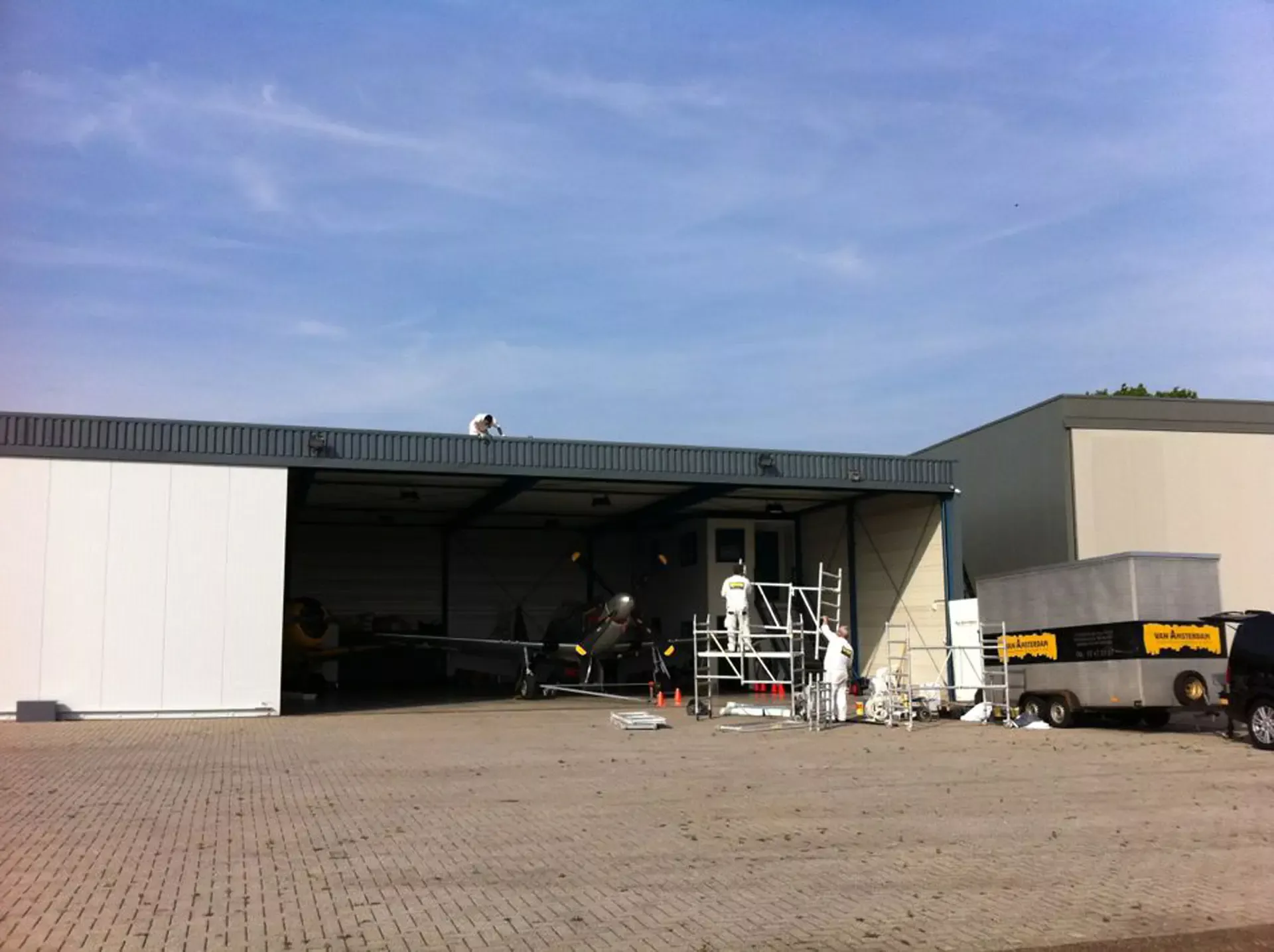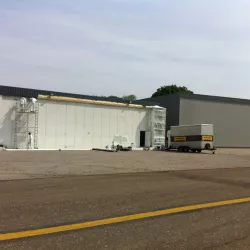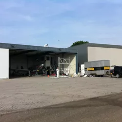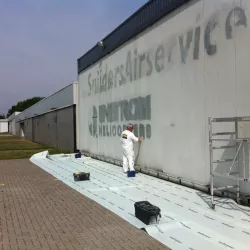 In België kregen we de bijzondere opdracht om de privéhangar van een verzamelaar van historische vliegtuigen te spuiten. De grootste uitdaging hierbij was het voorkomen van verfnevel op de onschatbare vliegtuigen. Met behulp van ons standaard afzuigsysteem hebben we rondom de steiger een vacuümunit gecreëerd, waardoor we veilig konden werken zonder risico op schade. De 40 meter lange deuren zijn vervolgens behandeld met een roestwerende verf, die garant staat voor minstens 10 jaar onderhoudsvrij gebruik.