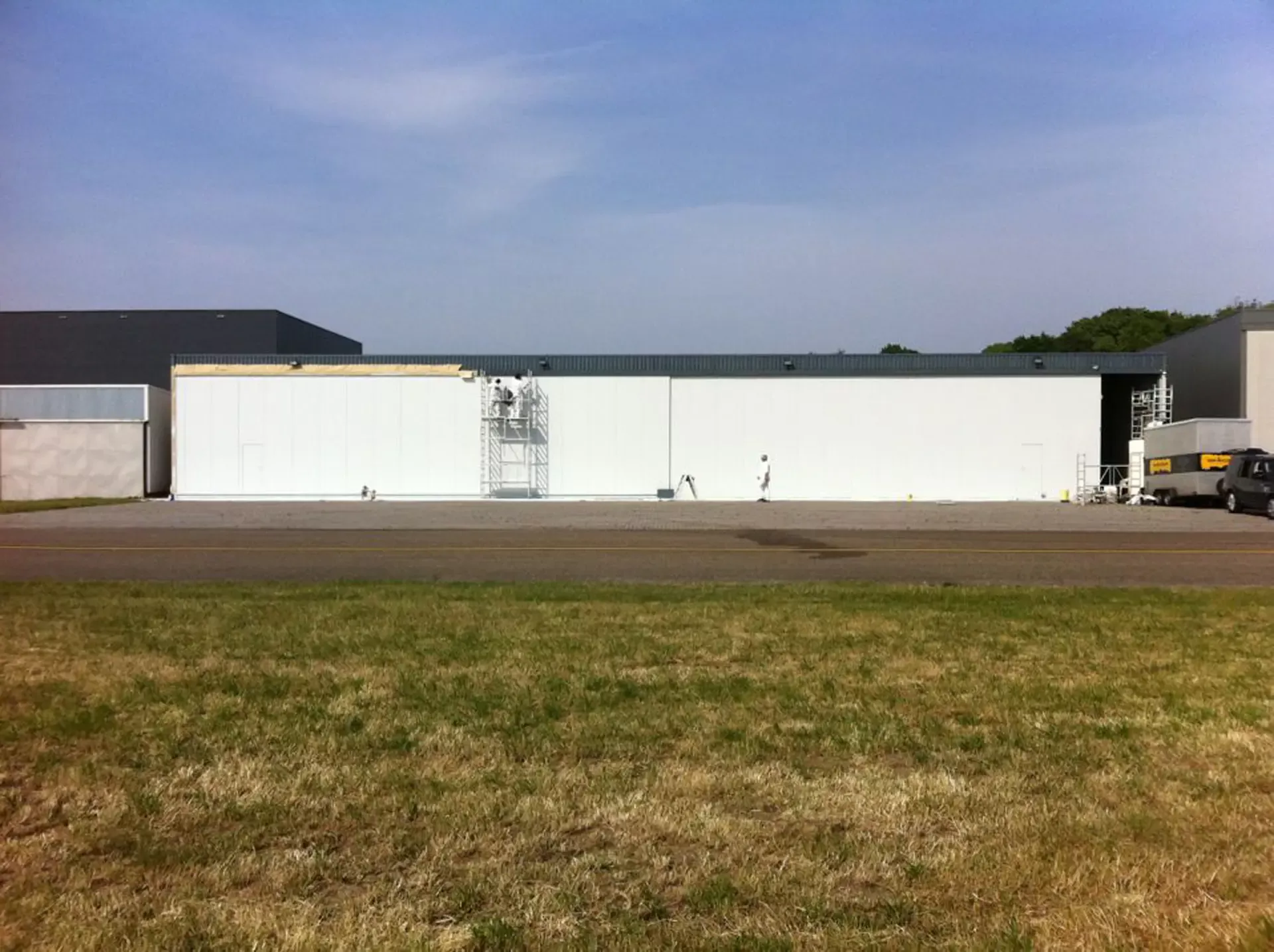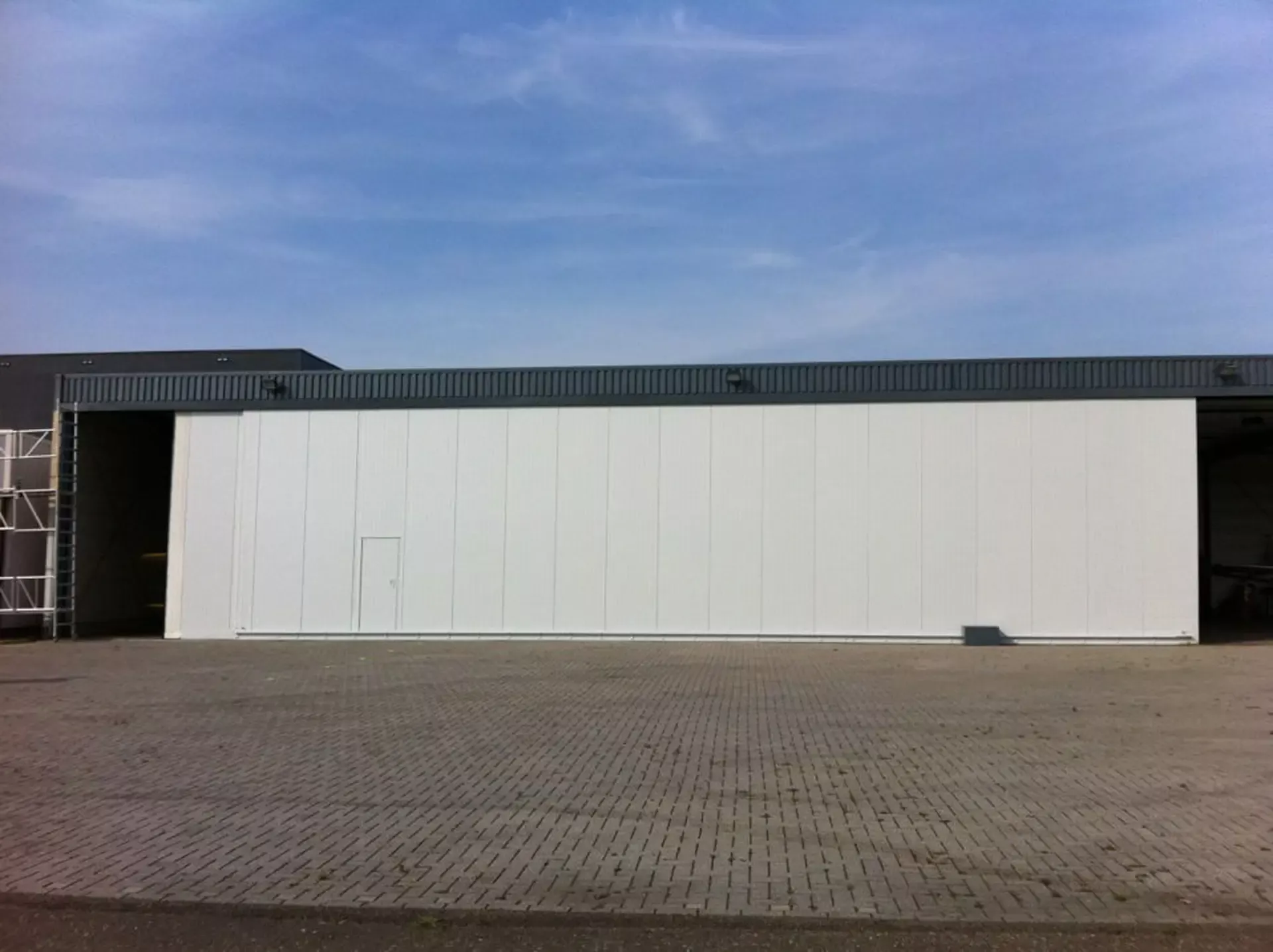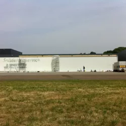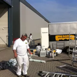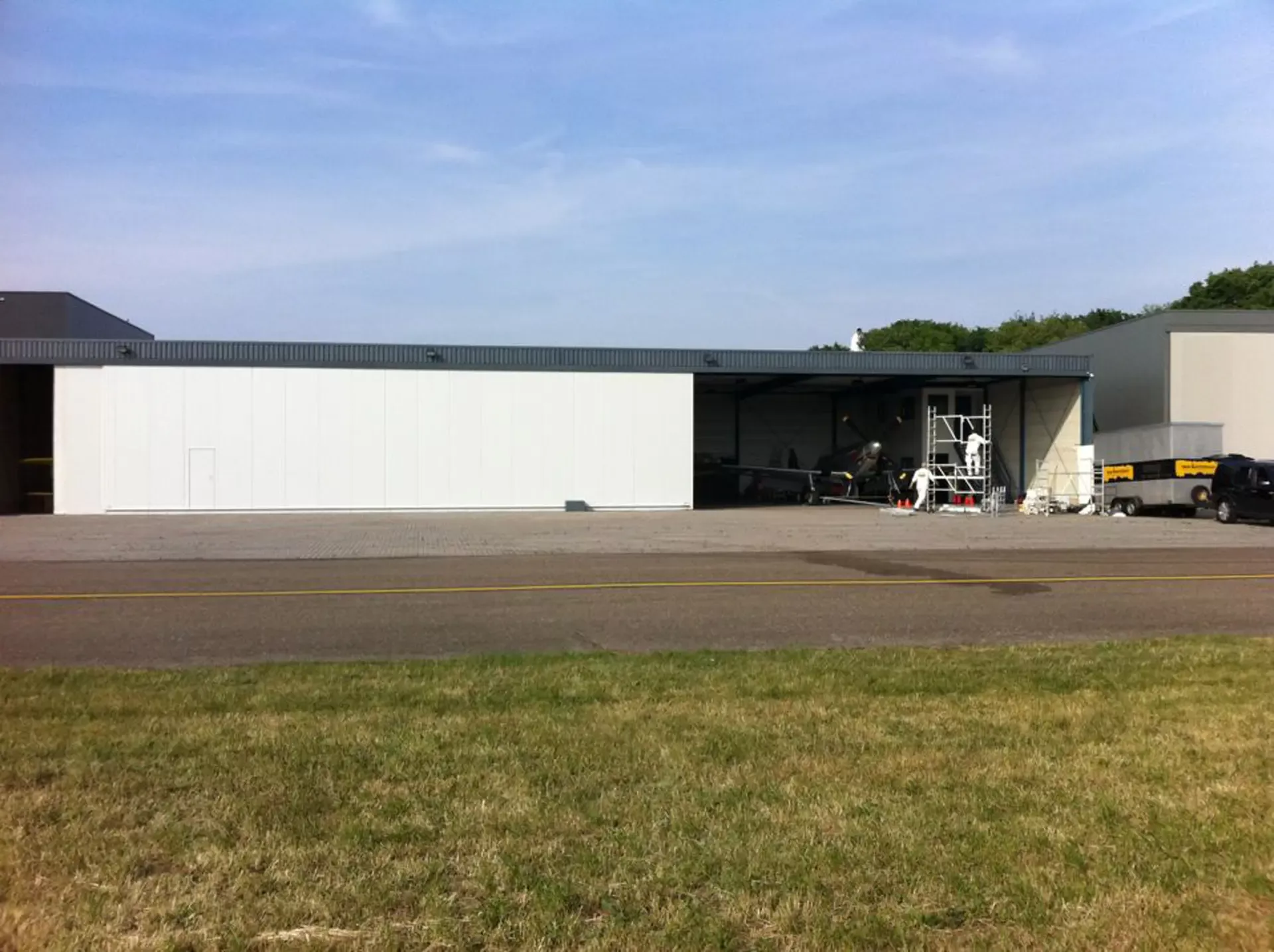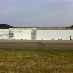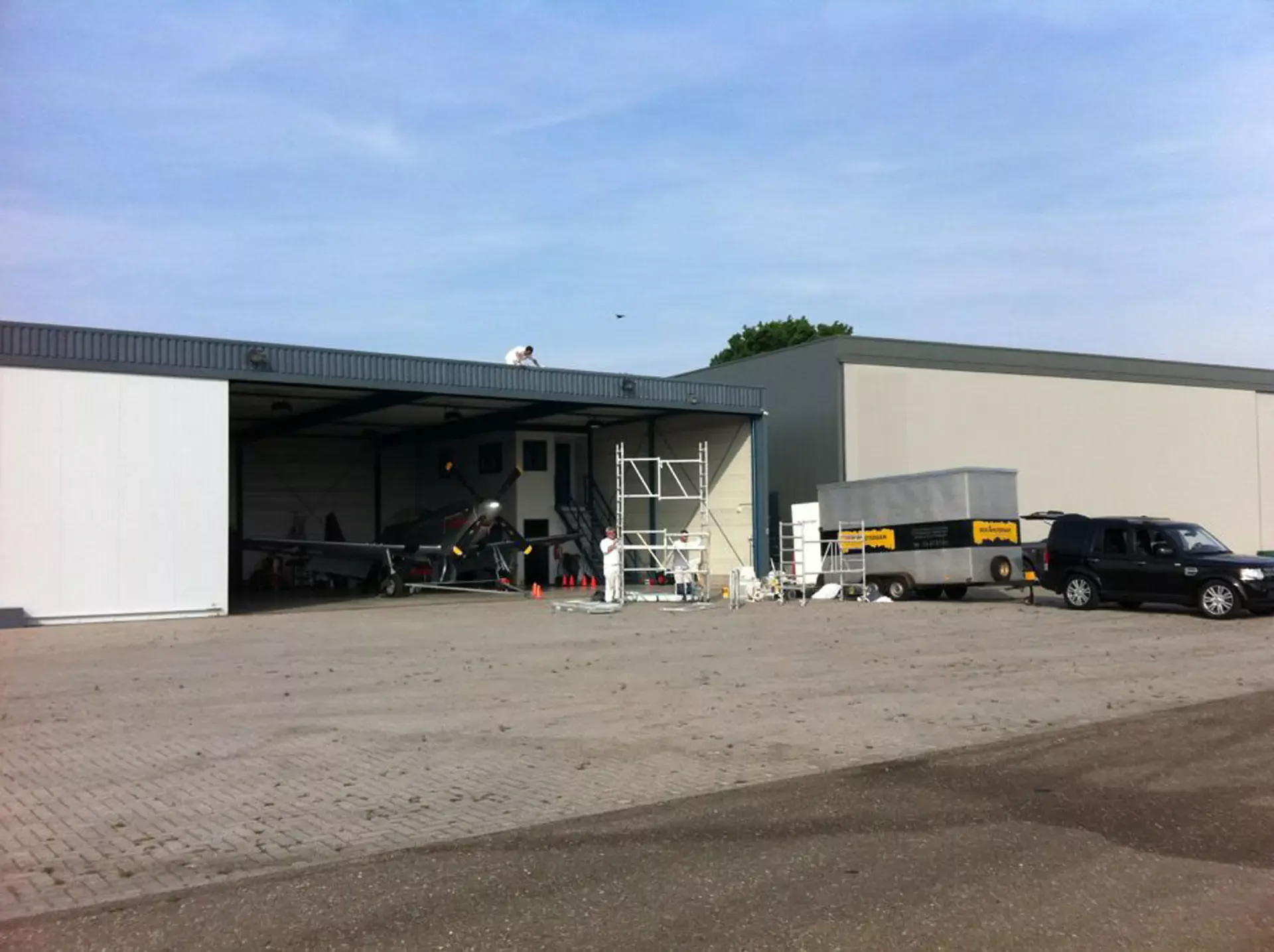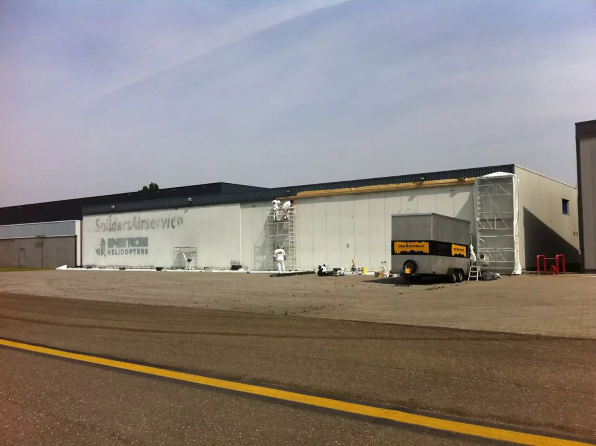 In België kregen we de bijzondere opdracht om de privéhangar van een verzamelaar van historische vliegtuigen te spuiten. De grootste uitdaging hierbij was het voorkomen van verfnevel op de onschatbare vliegtuigen. Met behulp van ons standaard afzuigsysteem hebben we rondom de steiger een vacuümunit gecreëerd, waardoor we veilig konden werken zonder risico op schade. De 40 meter lange deuren zijn vervolgens behandeld met een roestwerende verf, die garant staat voor minstens 10 jaar onderhoudsvrij gebruik.