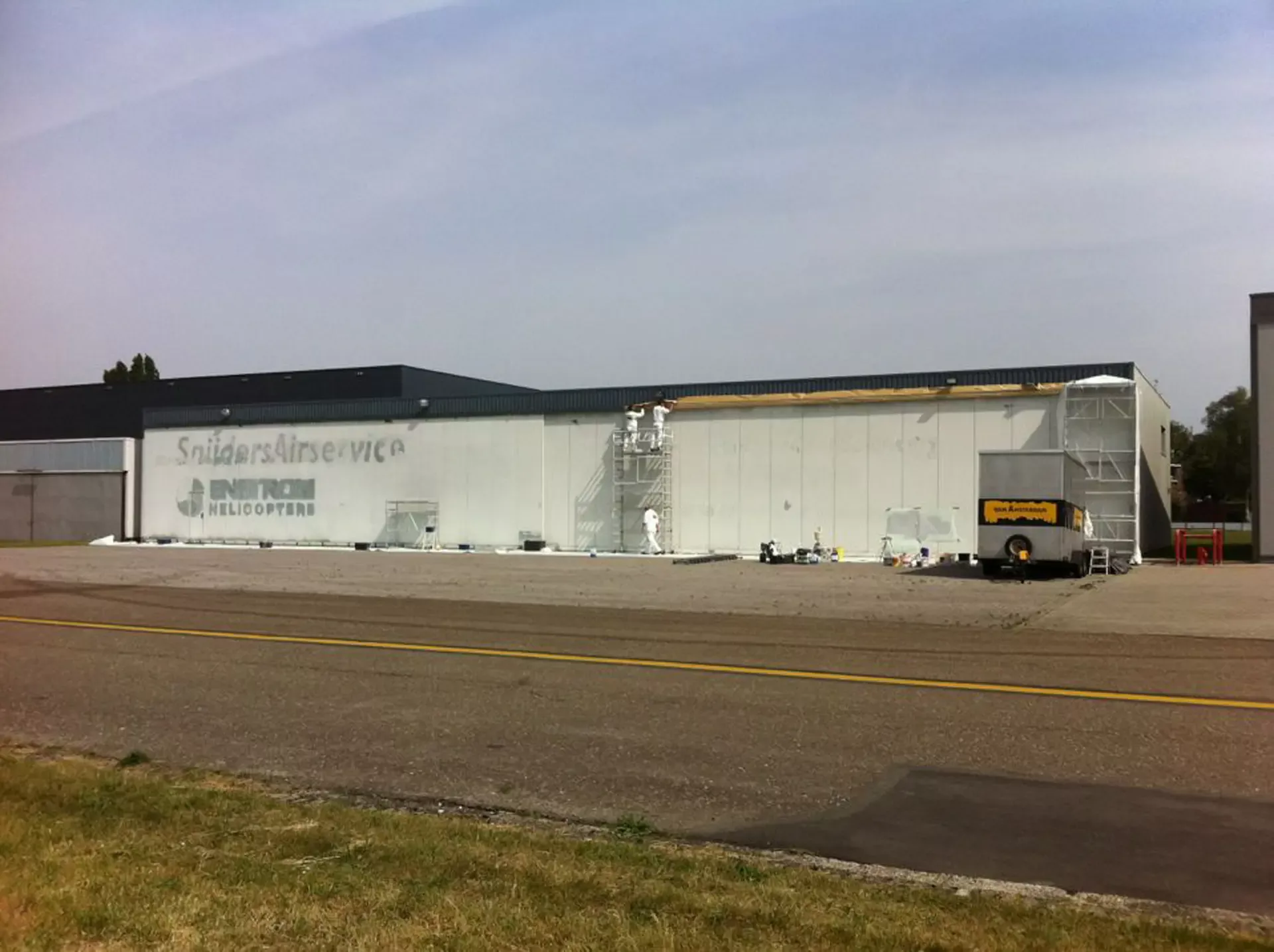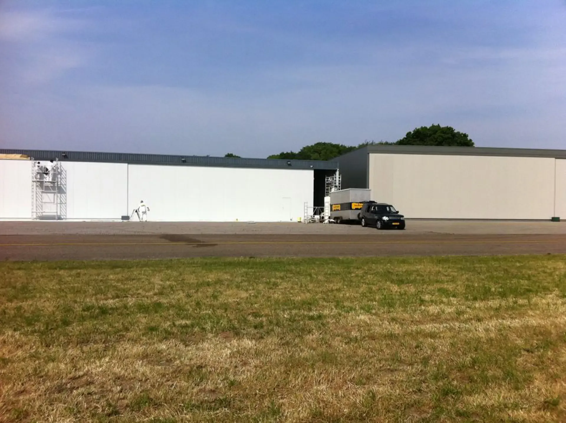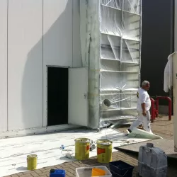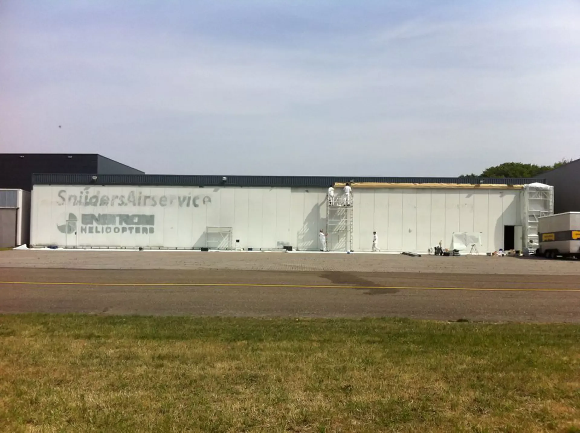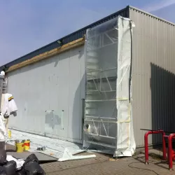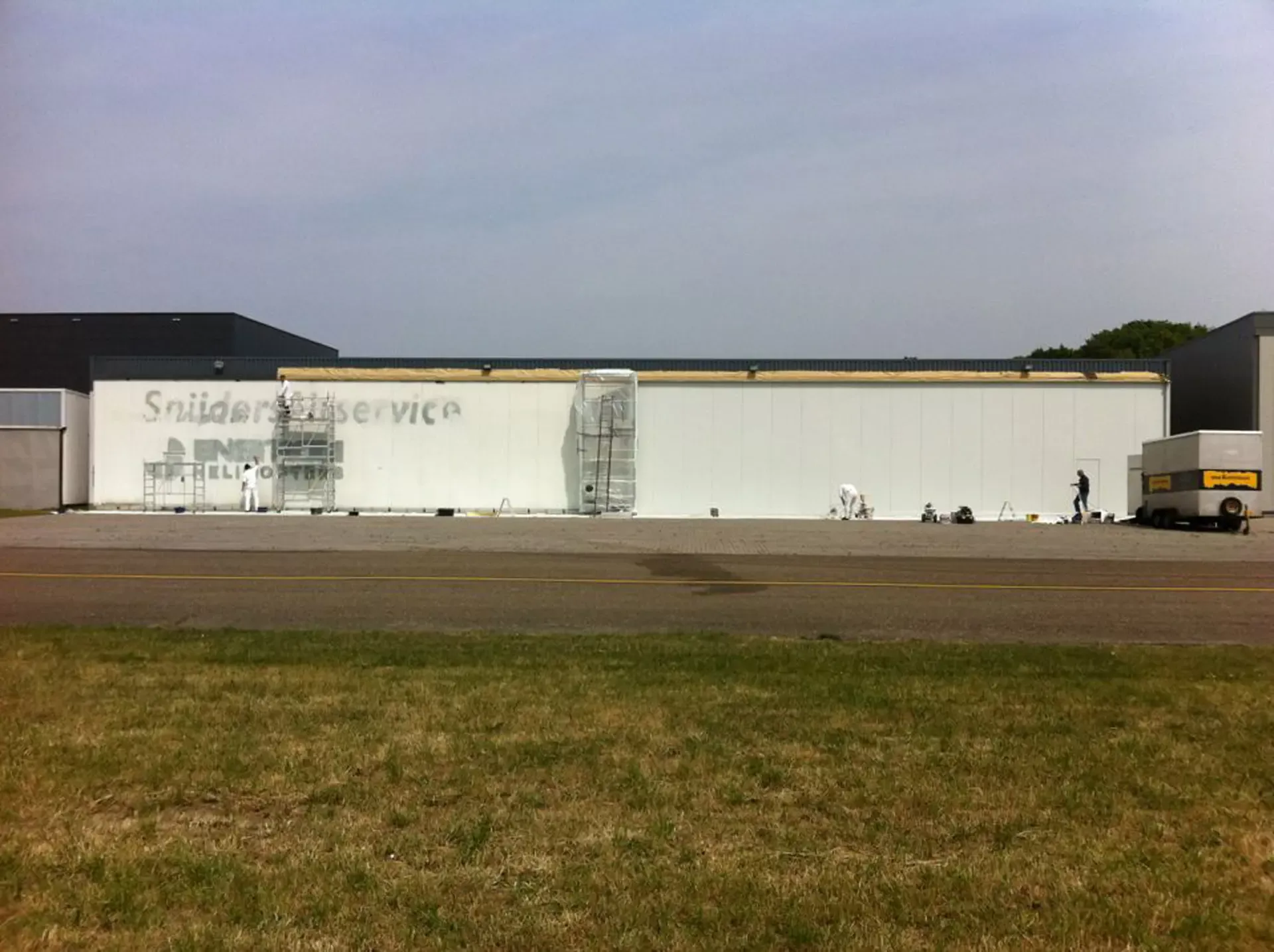 In België kregen we de bijzondere opdracht om de privéhangar van een verzamelaar van historische vliegtuigen te spuiten. De grootste uitdaging hierbij was het voorkomen van verfnevel op de onschatbare vliegtuigen. Met behulp van ons standaard afzuigsysteem hebben we rondom de steiger een vacuümunit gecreëerd, waardoor we veilig konden werken zonder risico op schade. De 40 meter lange deuren zijn vervolgens behandeld met een roestwerende verf, die garant staat voor minstens 10 jaar onderhoudsvrij gebruik.