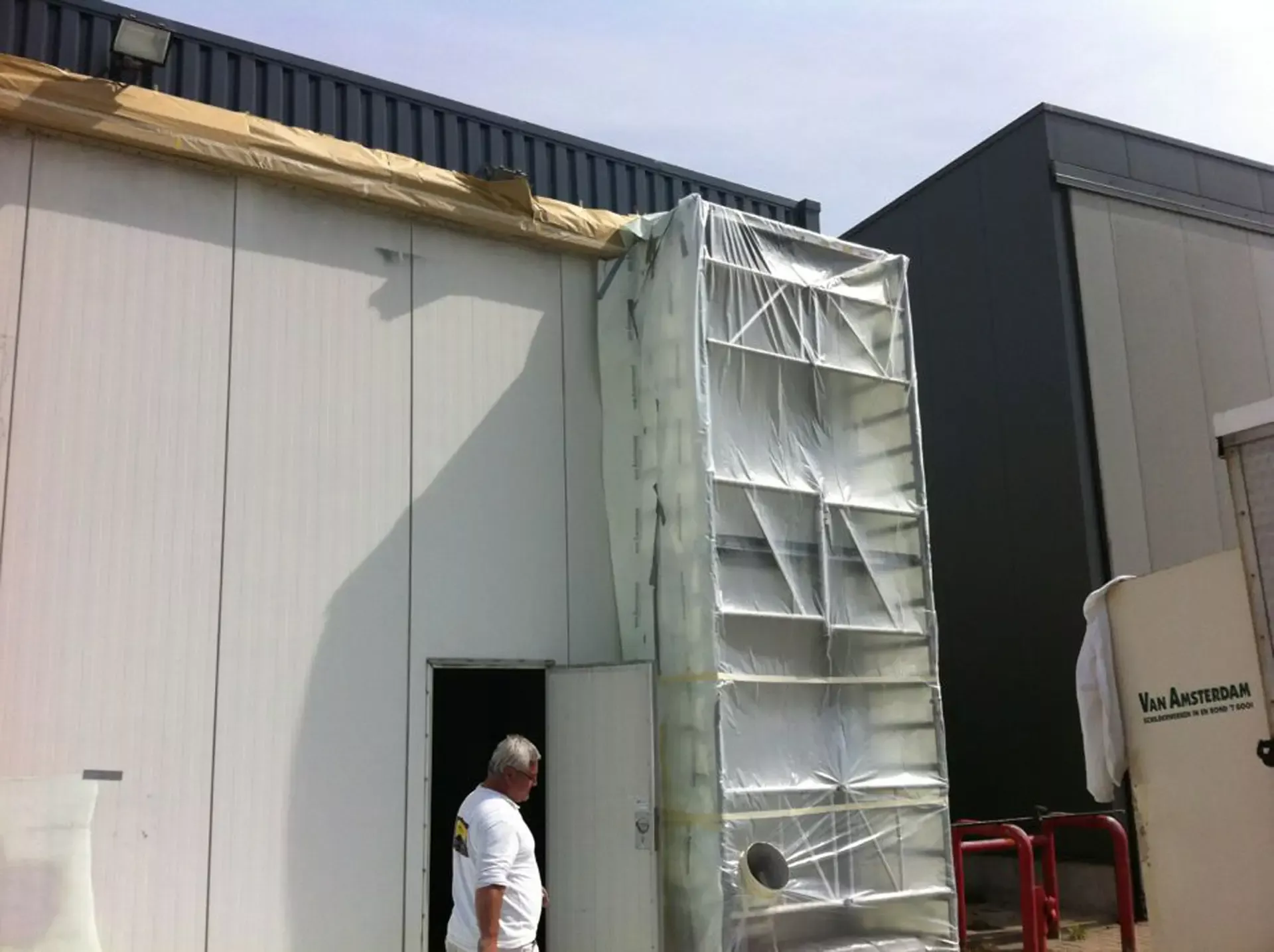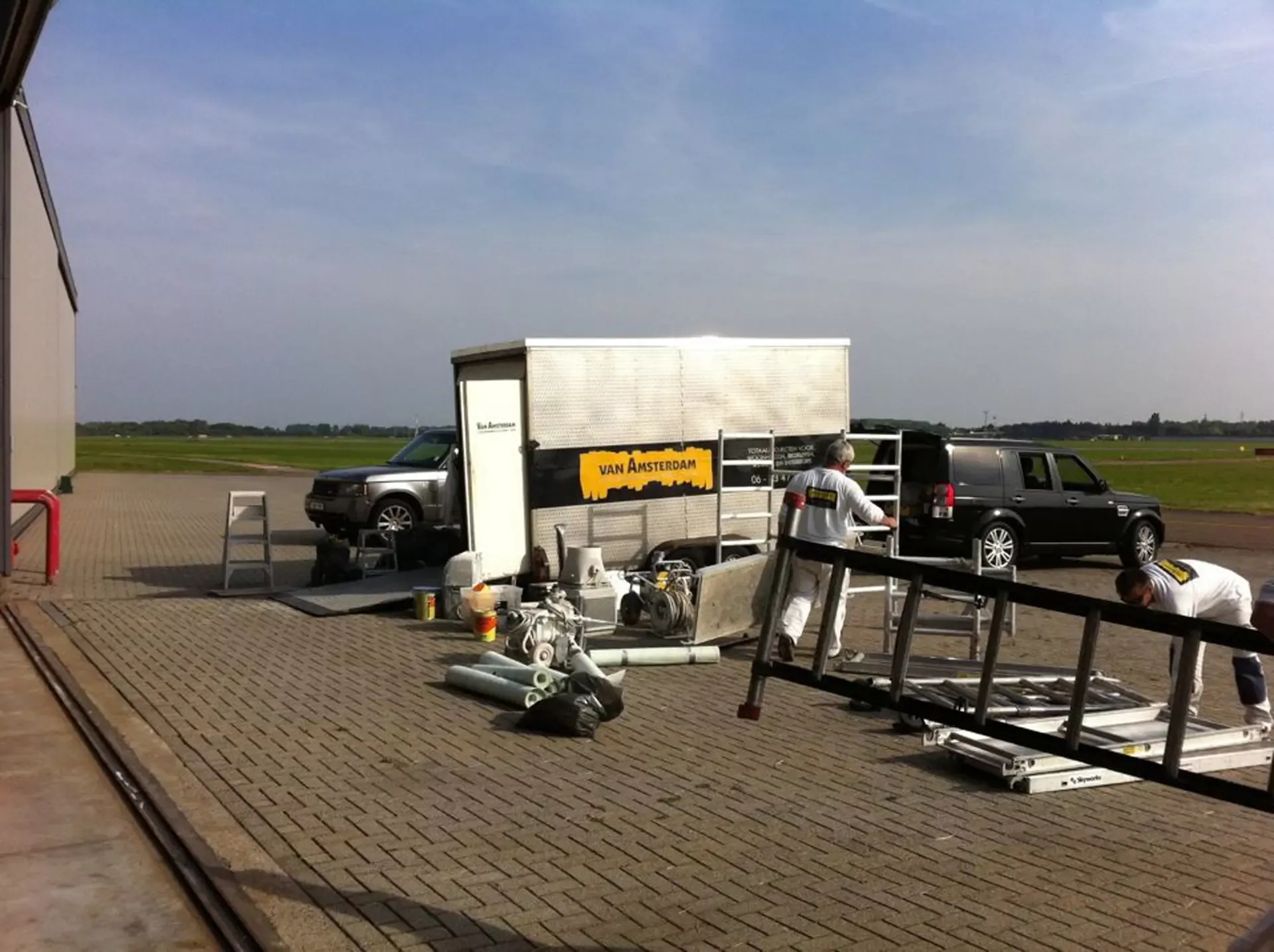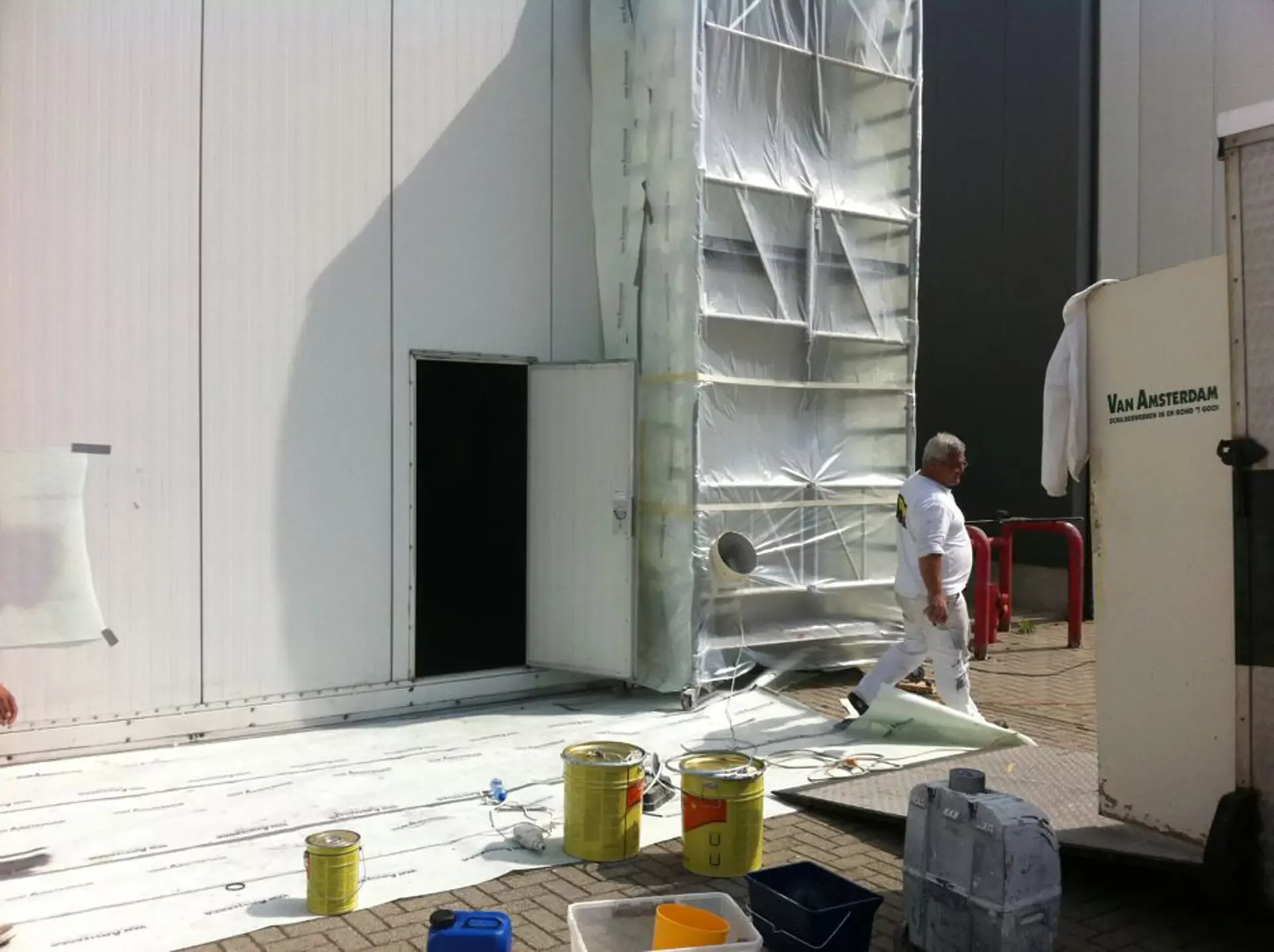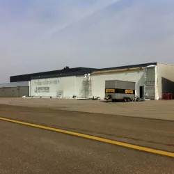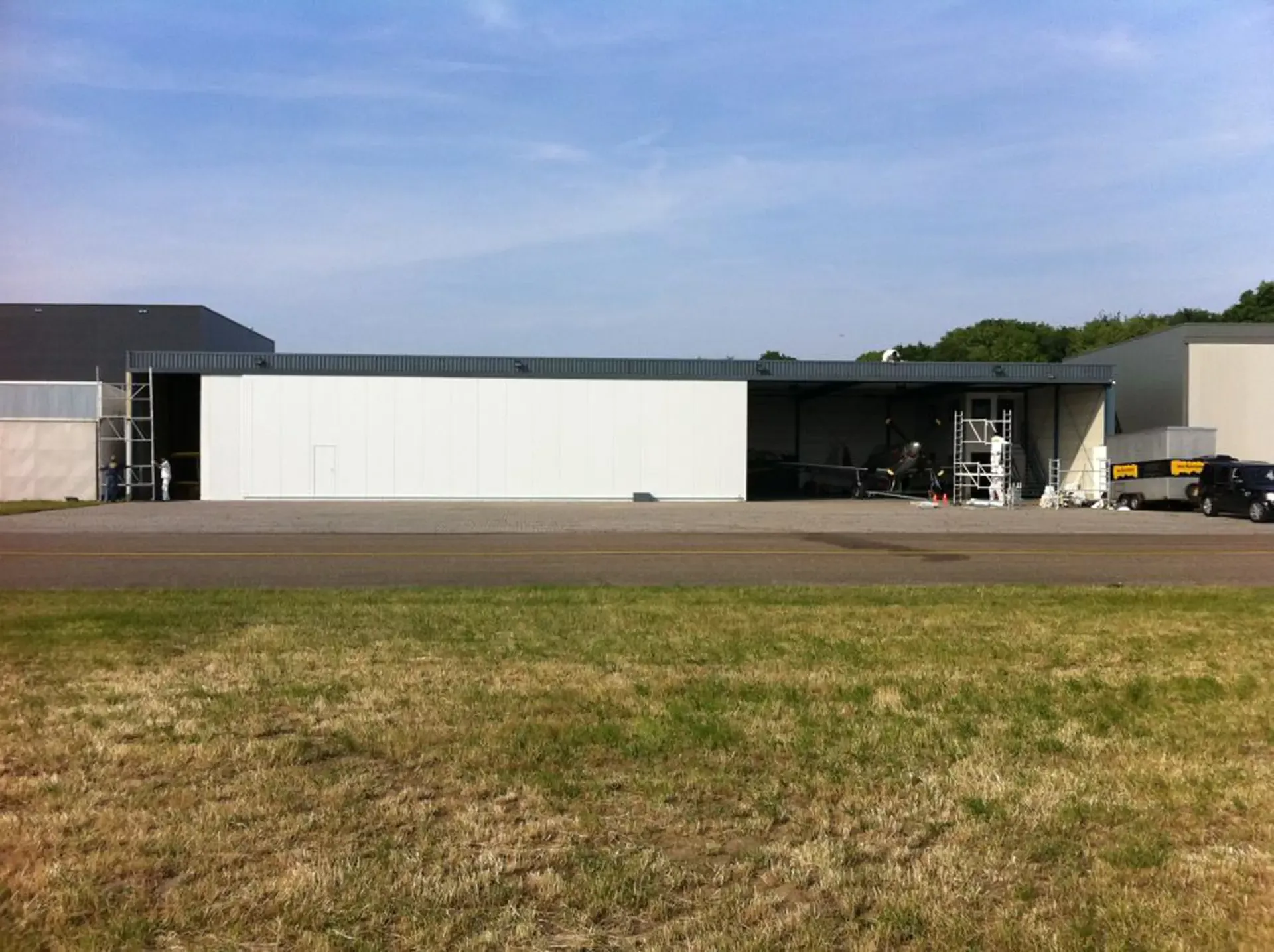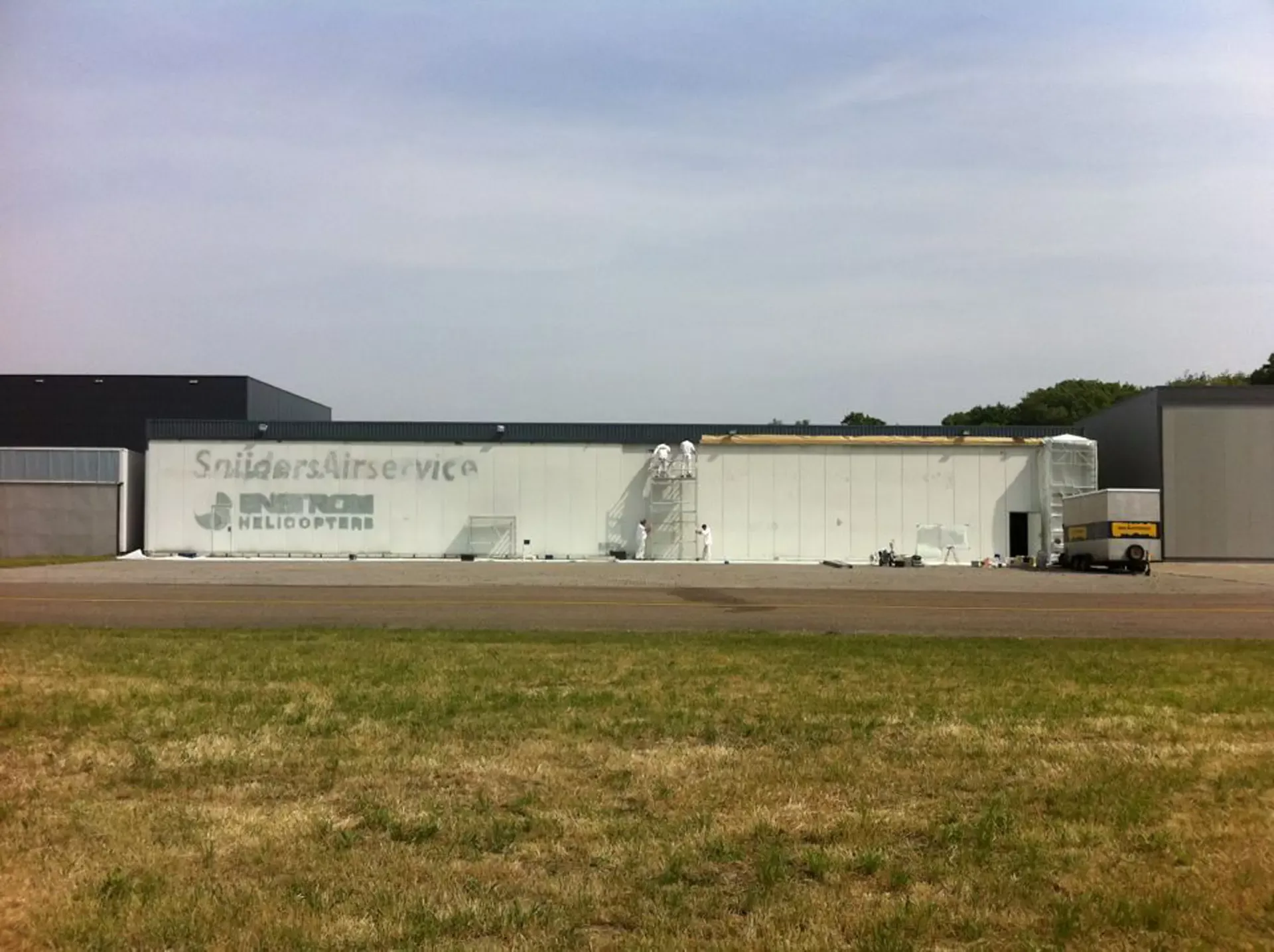 In België kregen we de bijzondere opdracht om de privéhangar van een verzamelaar van historische vliegtuigen te spuiten. De grootste uitdaging hierbij was het voorkomen van verfnevel op de onschatbare vliegtuigen. Met behulp van ons standaard afzuigsysteem hebben we rondom de steiger een vacuümunit gecreëerd, waardoor we veilig konden werken zonder risico op schade. De 40 meter lange deuren zijn vervolgens behandeld met een roestwerende verf, die garant staat voor minstens 10 jaar onderhoudsvrij gebruik.